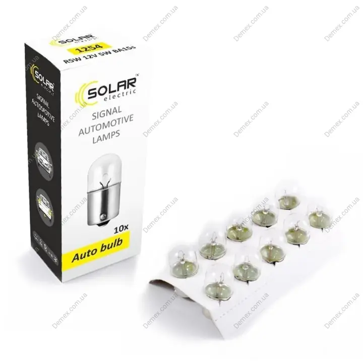 - Заказывайте онлайн — забирайте в одном из филиалов DEMEX в Киеве или оформляйте заказ с адресной доставкой по столице или доставку по Украине. Мы знаем, как важно бывает срочно заменить автолампа R5W BA15s 5 W прозрачная SOLAR 1254, поэтому работаем на скорость: отправляем заказы, оформленные до 15-00 день-в-день.