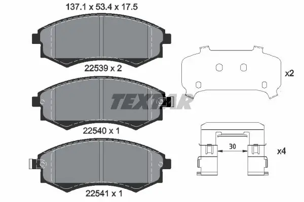 Комплект гальмівних колодок передн, DAEWOO KORANDO, HYUNDAI COUPE I, ELANTRA III, GETZ, LANTRA I, LANTRA II, MATRIX, SONATA II, SONATA III, SONATA IV, KIA JOICE, MITSUBISHI SANTAMO 1.4-3.2 09.88- TEXTAR 2253901