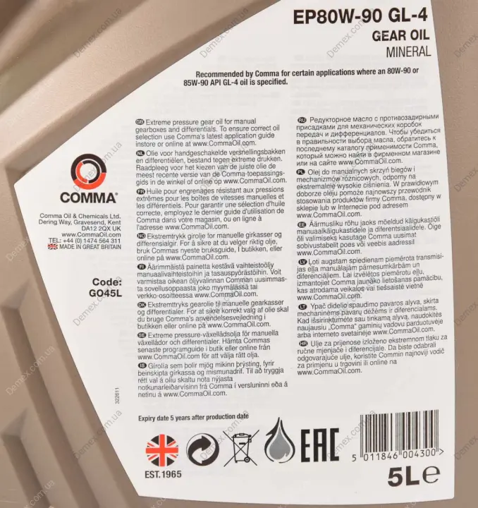 Трансмісійна олива EP80W-90 GL-4 GL-3 / 4 80W-90 мінеральна 5 л COMMA GO45L